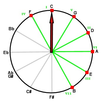 The circle of fifths behaves like a compass in which degrees I, IV and V swing around the tonic. (In the above figures, the needle of our tonal compass designates the tonic.)